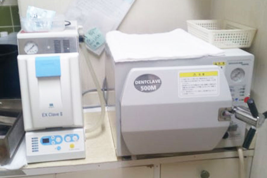 院内感染予防のため、2台の高圧蒸気滅菌器を使用し、タービン、コントラ、エアースケーラー、超音波スケーラーなどのすべての器具類を、患者さまお一人ごとに滅菌処理をしています。